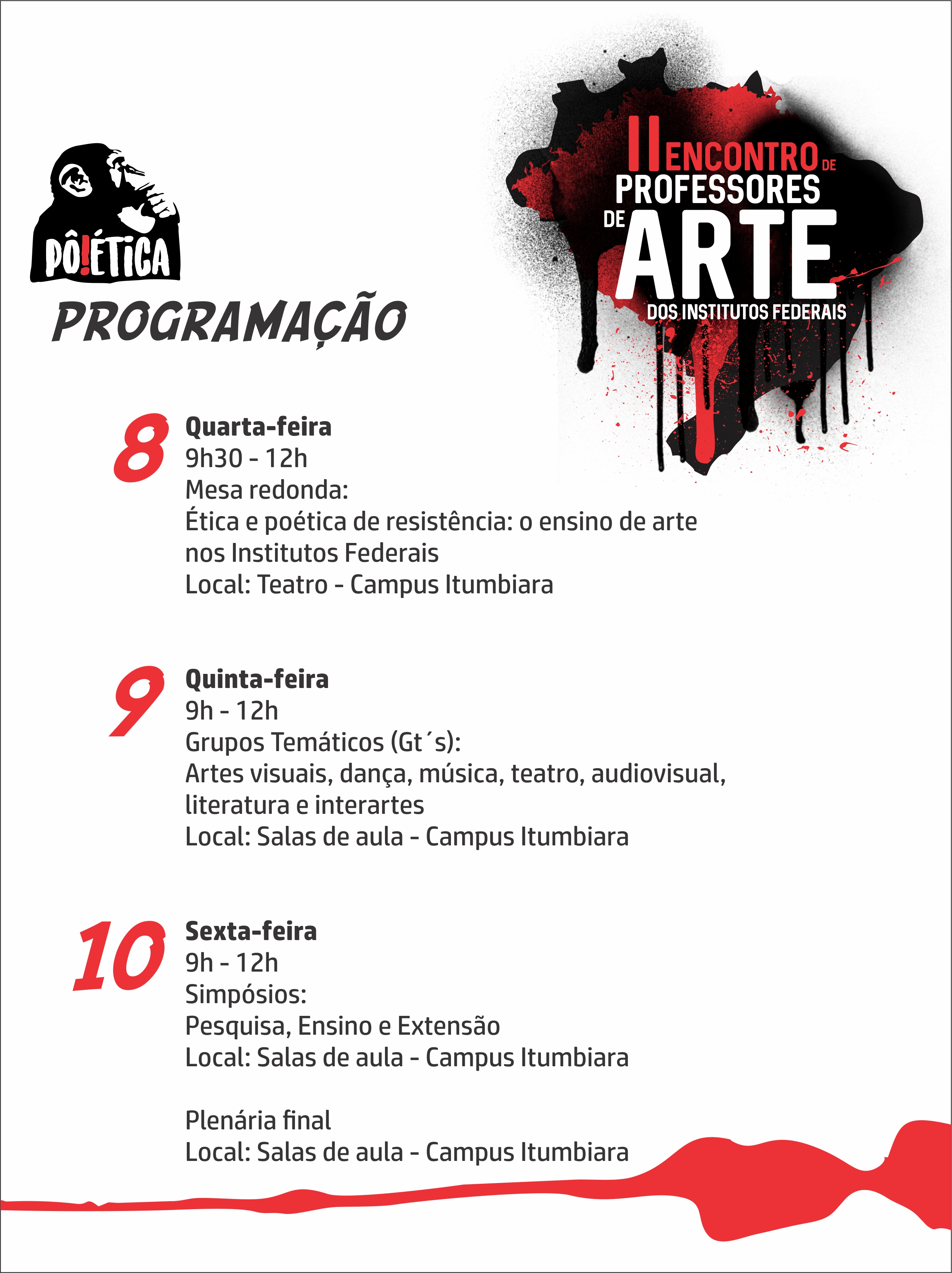 O evento contará com uma mesa de abertura no dia 8, pela manhã, e grupos temáticos (GTs) no dia 9, pela manhã (dentro do Festival). No dia 10 acontecerão três simpósios (Ensino, Pesquisa e Extensão) pela manhã e uma plenária pela tarde, na qual será construído um documento que dê visualidade às questões levantadas, discutidas e encaminhadas pelos participantes.