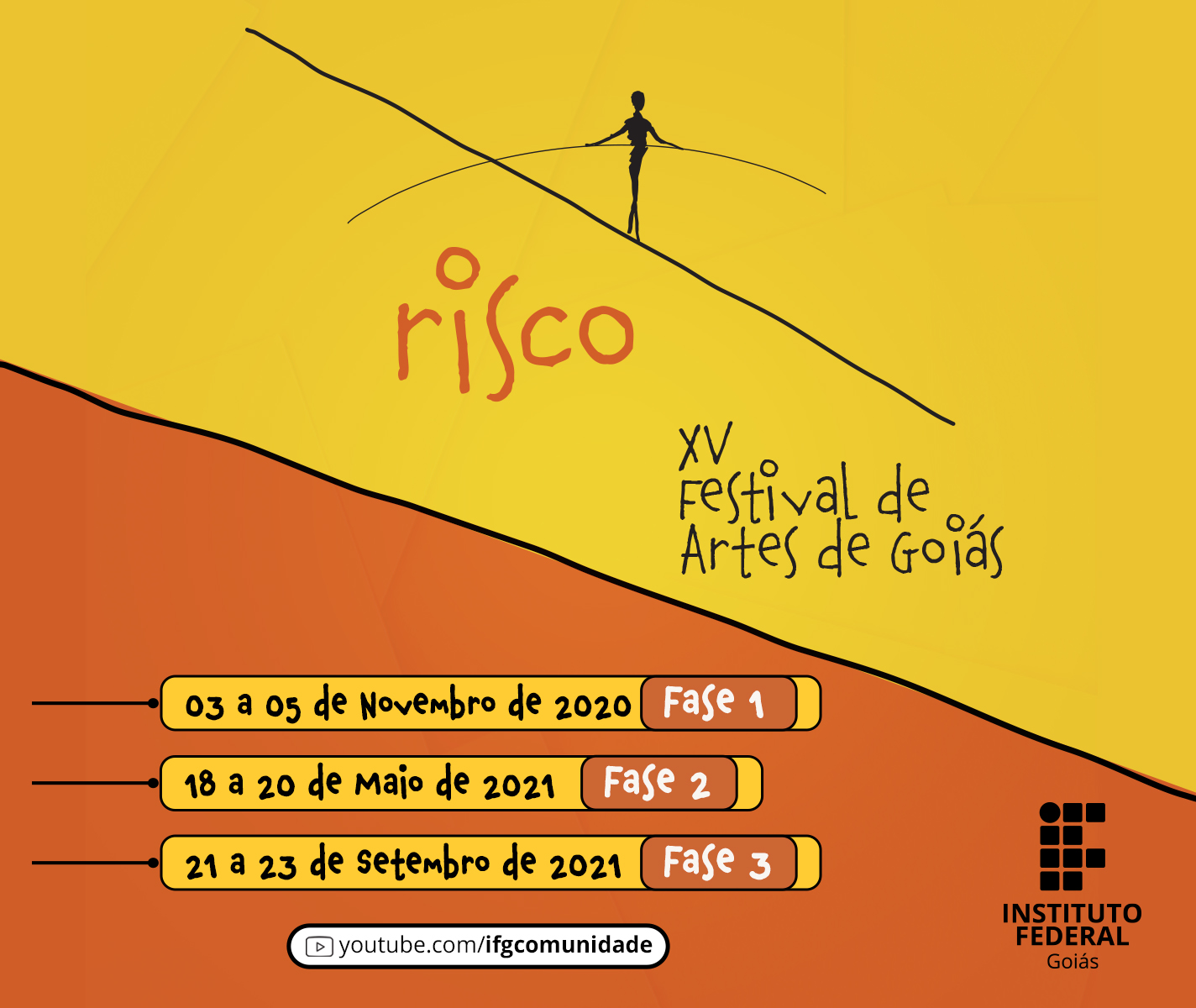 A primeira etapa do XV Festival de Artes de Goiás aconteceu remotamente entre 03 e 05 de novembro de 2020, marcando o início da programação sob o tema “O Risco”. Nesses três dias, o evento ofereceu palestras sobre arte, cultura e ensino, além de apresentações culturais e artísticas transmitidas pelo canal IFG Comunidade (YouTube). A abertura contou com autoridades do IFG e uma mesa-redonda virtual que discutiu política cultural em instituições públicas de ensino. Ao longo da Fase 1, ocorreram debates sobre as diretrizes curriculares da arte no ensino médio integrado, reflexões sobre os desafios do ensino remoto de arte, e apresentações artísticas da comunidade acadêmica no quadro “Arrisque-se”.