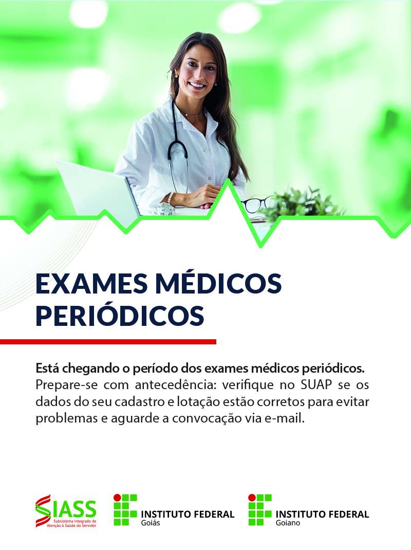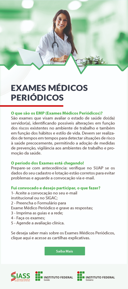 O Grupo de Trabalho (GT) para os Exames Periódicos está à frente da coordenação desta ação e está articulado com as CISSPs nos câmpus para a total adesão dos(as) servidores(as). A divulgação está em curso foi disponibilizada cartilha atualizada para os servidores(as) do IFG e do IF Goiano: Cartilha EMP 2025