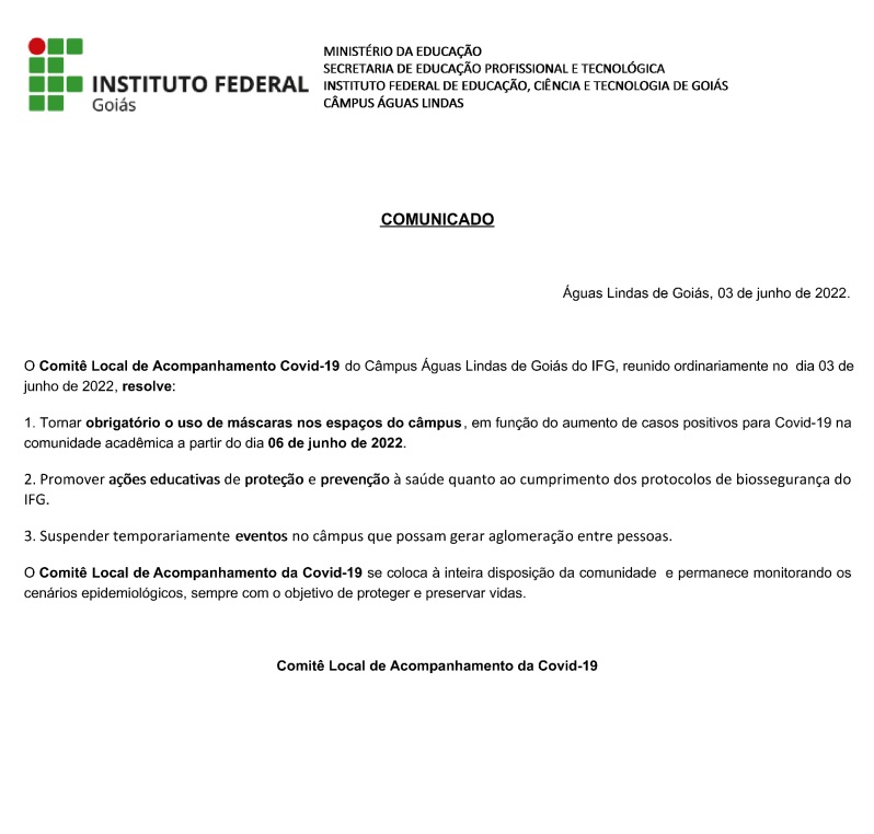 Você está aqui: Página inicial > Comunicados do Câmpus Águas Lindas > Comunicado do Comitê Local de Acompanhamento Covid-19