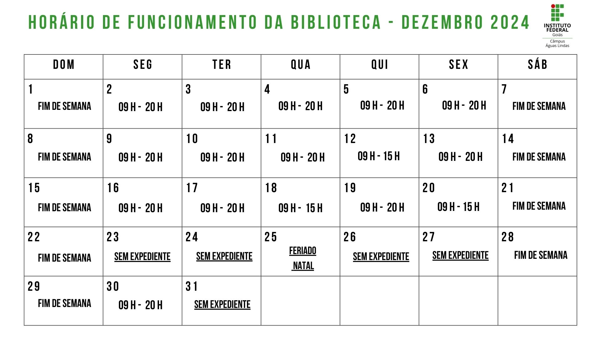 Você está aqui: Página inicial > Comunicados do Câmpus Águas Lindas > Horário de funcionamento da biblioteca - dezembro