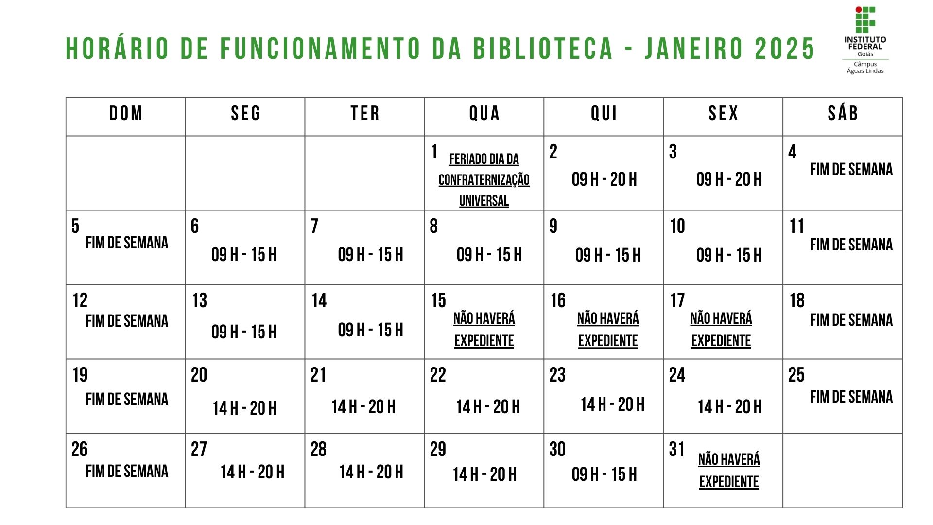 Horário de funcionamento da biblioteca - Janeiro 2025