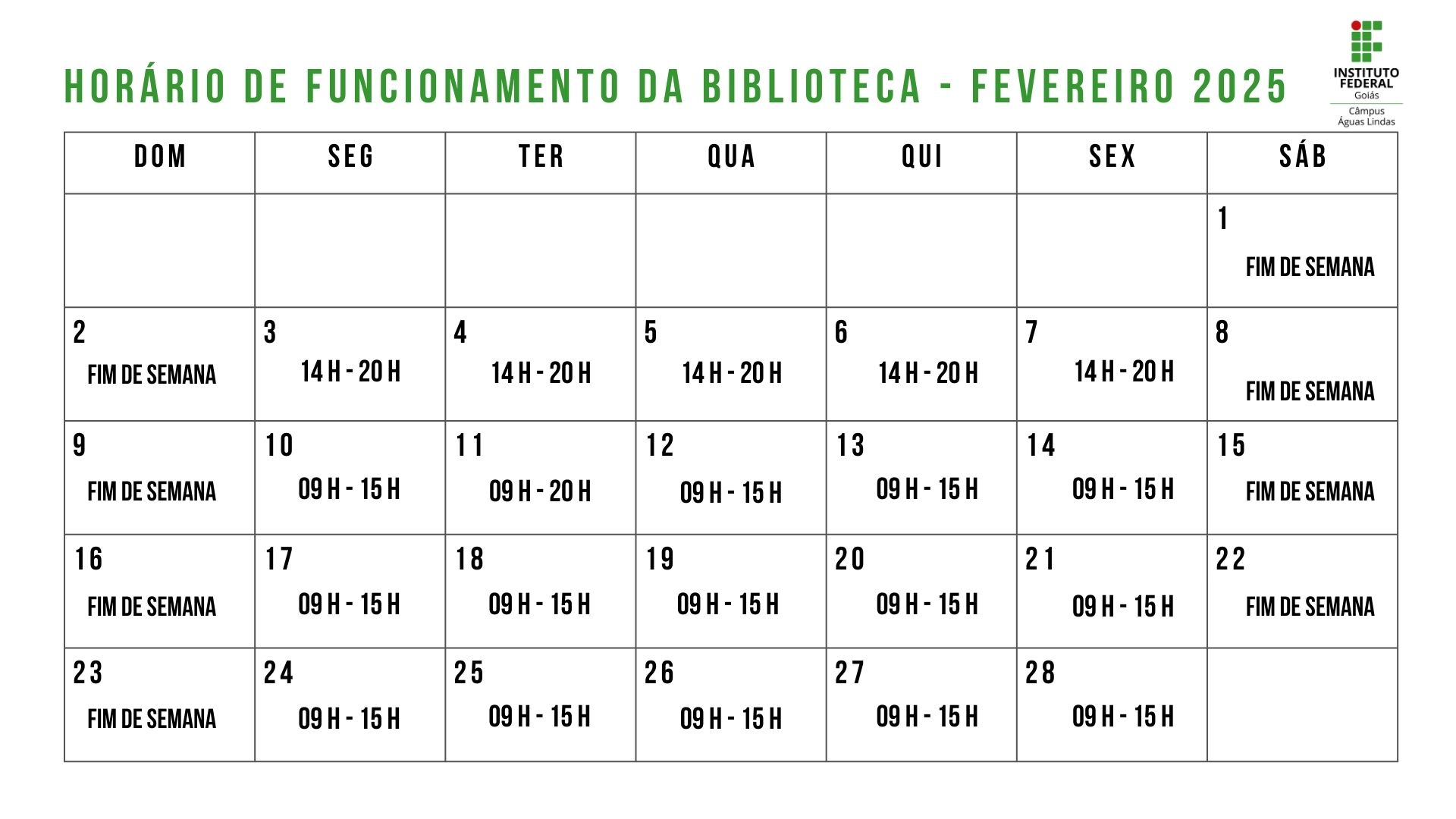 Você está aqui: Página inicial > Comunicados do Câmpus Águas Lindas > Horário de funcionamento da biblioteca - Fevereiro 2025