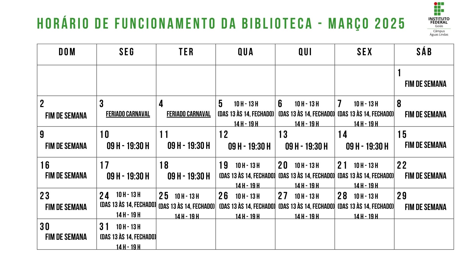 Você está aqui: Página inicial > Comunicados do Câmpus Águas Lindas > Horário de funcionamento da biblioteca - Março 2025