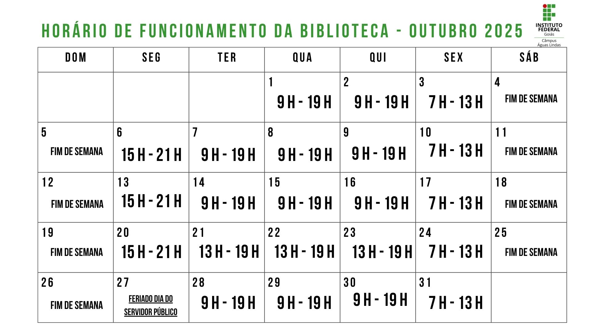 Você está aqui: Página inicial > Comunicados do Câmpus Águas Lindas > Horário de funcionamento da biblioteca - outubro