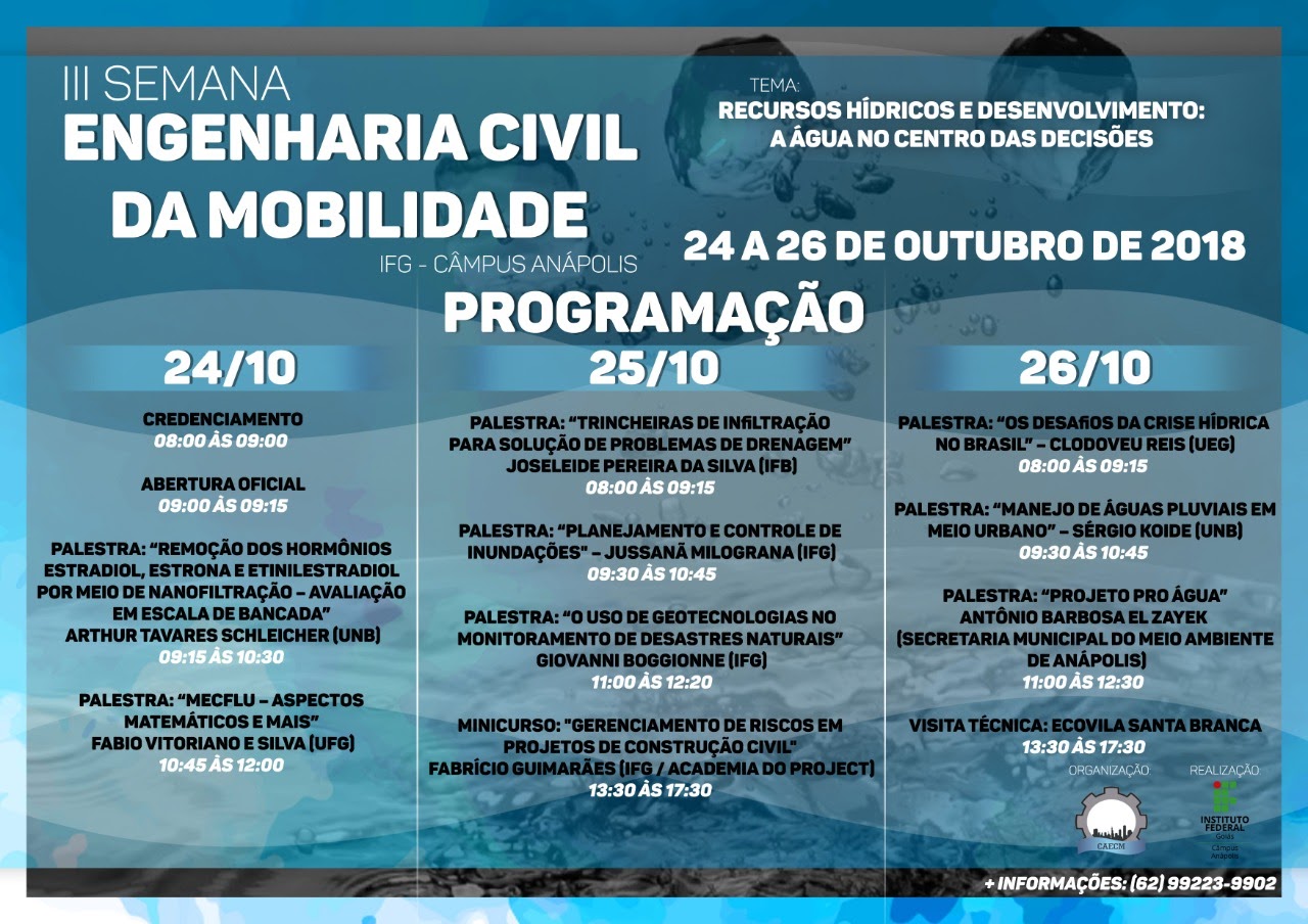 Começa na próxima quarta-feira, 24, a III Semana de Engenharia Civil da Mobilidade do Instituto Federal de Goiás (IFG) - Câmpus Anápolis. O evento, que será realizado até o dia 26 de outubro, terá ampla programação, composta de diversas palestras, minicurso e visita técnica. O tema central da Semana é: Recursos hídricos e desenvolvimento: a água no centro das decisões. Inscrições ainda estão abertas e podem ser feitas no endereço: computacaoifg.com.br/gci.