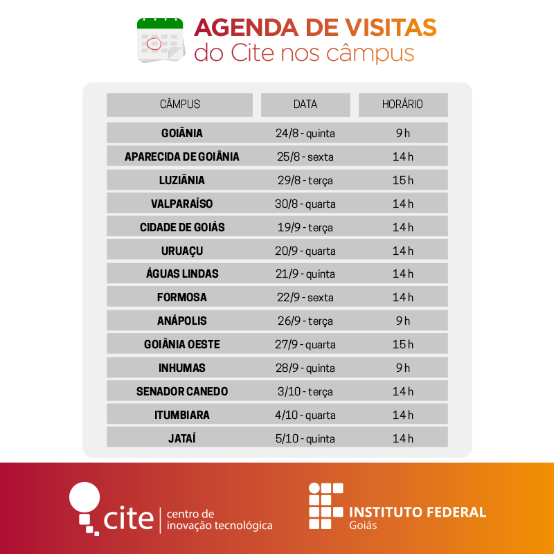 Entre os meses de agosto a outubro, os membros do Centro de Inovação Tecnológica do Instituto Federal de Goiás farão visitas em todos os câmpus da Instituição. De acordo com o pró-reitor de Pesquisa e Pós-Graduação, professor Ruberley Rodrigues de Souza, as ações têm como objetivo apresentar o Cite, suas realizações e seus números, a alunos, docentes e servidores. Além disso, será apresentado à comunidade acadêmica do IFG o planejamento do setor para os próximos dois anos.