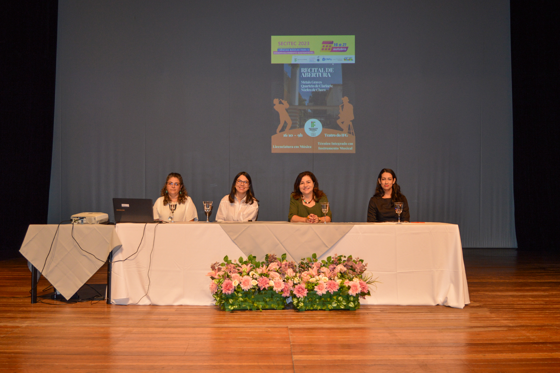 Mesa diretiva da solenidade de abertura da Secitec 2023 ( da esquerda para direita): a gerente de Pesquisa, Pós-Graduação e Extensão do Câmpus Goiânia do IFG, professora Fabiane Oliveira; a diretora de Pesquisa e Inovação do IFG, Lorenna Costa; a diretora-geral do Câmpus Goiânia do IFG, professora Adriana Ferreira; e a coordenadora-geral da Secitec 2023 do Câmpus Goiânia, professora Karoline Fernandes.