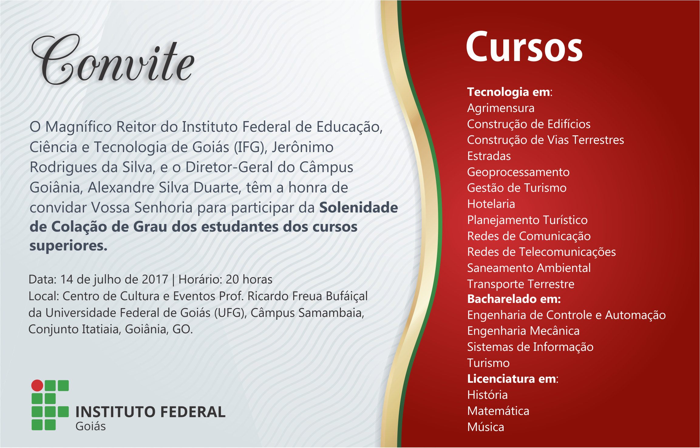 O Instituto Federal de Goiás (IFG) – Câmpus Goiânia realiza nesta sexta-feira, 14 de julho, a cerimônia de colação de grau 2017/1 dos cursos superiores. A formatura será realizada, às 20 horas, no Centro de Eventos Professor Ricardo Freua Bufáiçal, no Câmpus Samambaia da Universidade Federal de Goiás (UFG), em Goiânia.