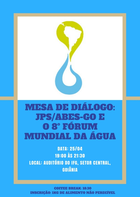 A Mesa de Diálogo sobre o VIII Fórum Mundial da Água abordará as temáticas discutidas no fórum, que aconteceu entre os dias 18 e 23 de março, em Brasília (DF). O evento é uma iniciativa dos Jovens Profissionais de Saneamento (JPS), com apoio da Associação Brasileira de Engenharia Sanitária e Ambiental - Seção Goiás (ABES - GO), do Crea - GO Jovem e Núcleo de Estudos e Pesquisas em Saneamento e Meio Ambiente (NEPSA) do IFG - Câmpus Goiânia .