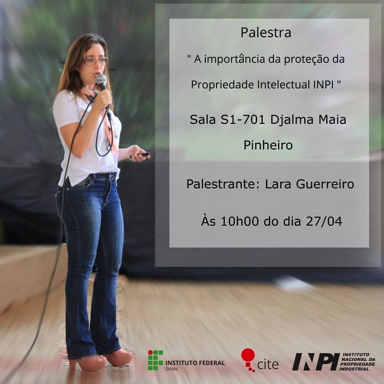 O Centro de Inovação Tecnológica (Cite) do Instituto Federal de Goiás (IFG) realizará nesta sexta-feira, 27 de abril, palestra: A importância da proteção da Propriedade Intelectual, às 10 horas, na Sala Djalma Maia (S1-701), no Câmpus Goiânia. A palestra será ministrada por Lara Guerreiro Pires, analista em Propriedade Industrial do Instituto Nacional de Propriedade Industrial (INPI).