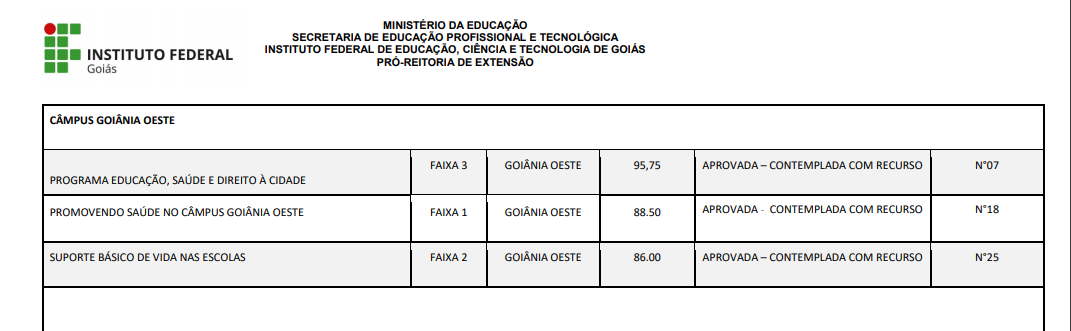 O Instituto Federal de Goiás (IFG), por meio da Pró-Reitoria de Extensão (Proex), divulgou o resultado final do edital 08/2021, relativo ao apoio financeiro para ações de extensão a cursos, projetos e programas. Foram selecionados três projetos do Câmpus Goiânia Oeste: Programa Educação Saúde e Direto à cidade; Promovendo saúde no Câmpus Goiânia Oeste, Suporte Básico de vida nas escolas.