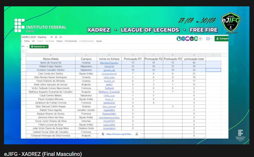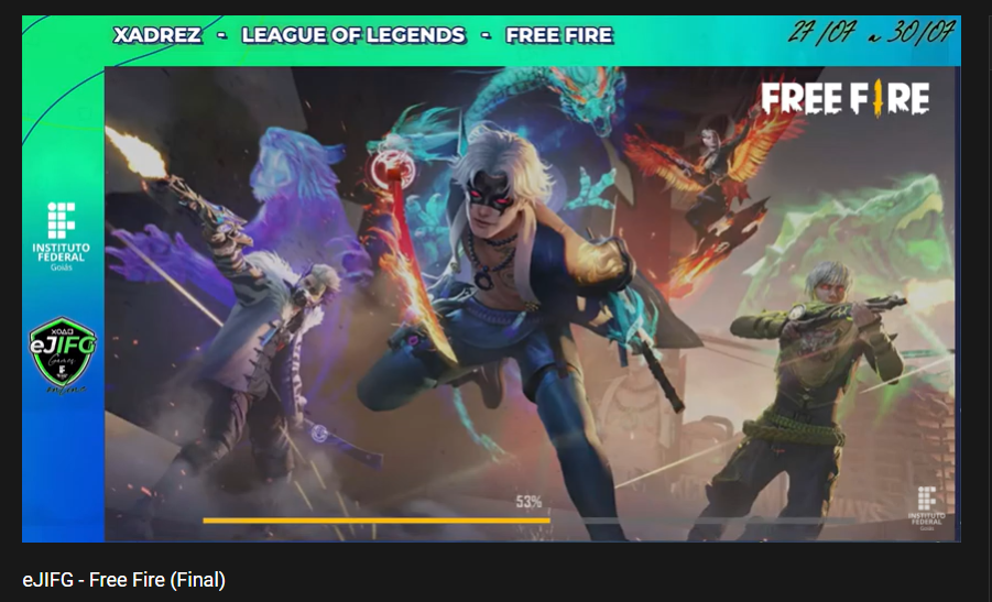 O Instituto Federal de Goiás (IFG) realizou a primeira edição do eJIFG, uma versão dos jogos internos da Instituição com jogos eletrônicos. O encerramento do eJIFG Games Goiás aconteceu na sexta-feira, 30 de junho, com a transmissão da final da modalidade League of Legends (LoL). O evento foi realizado de forma online e contou com participantes de 12 câmpus da Instituição que participaram em três modalidades: xadrez, Free Fire e LoL. Os jogos foram realizados no período de 27 a 30 de julho. A transmissão das finais foi feita virtualmente e pode ser conferida no canal IFG Comunidade no YouTube.