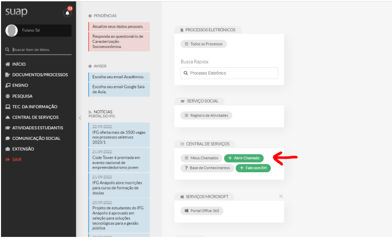 2) Na tela inicial, no campo "Central de Serviços", clique em "Abrir chamado"