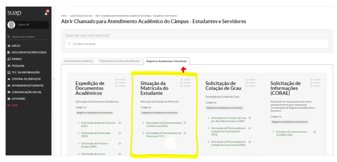 Obs.: a pessoa interessada é a/o próprio estudante que faz o registro do chamado.
