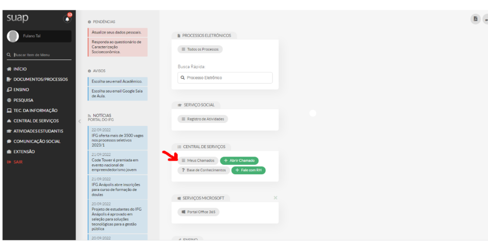 6) Feito o registro do chamado, acompanhe o andamento na página inicial do SUAP, clicando em "Meus Chamados".