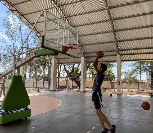 Tabelas móveis de basquete são instaladas na quadra coberta