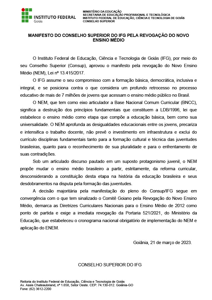 Leia o Manifesto do Conselho Superior do IFG pela revogação do novo Ensino Médio: https://www.ifg.edu.br/attachments/article/209/manifestação%20NEM.pdf