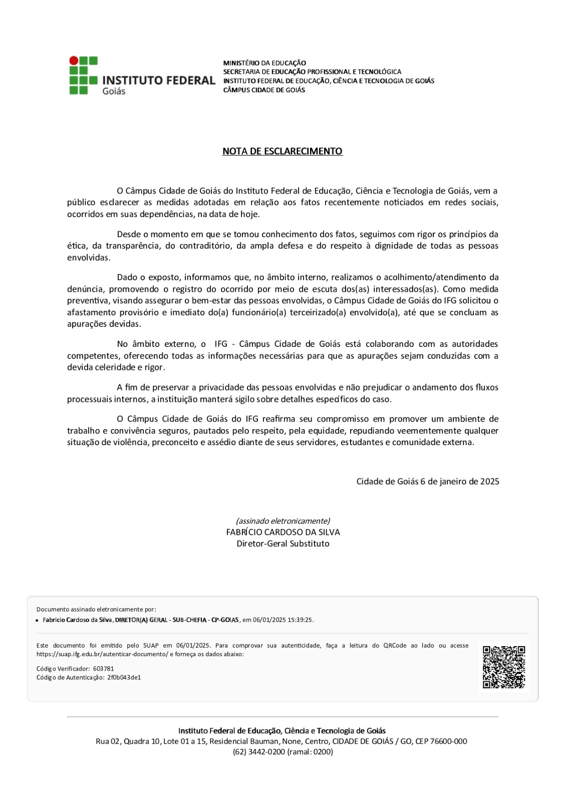 Nota de esclarecimento sobre fatos recentemente veiculados em redes sociais, ocorridos nas dependências do IFG - Câmpus Cidade de Goiás