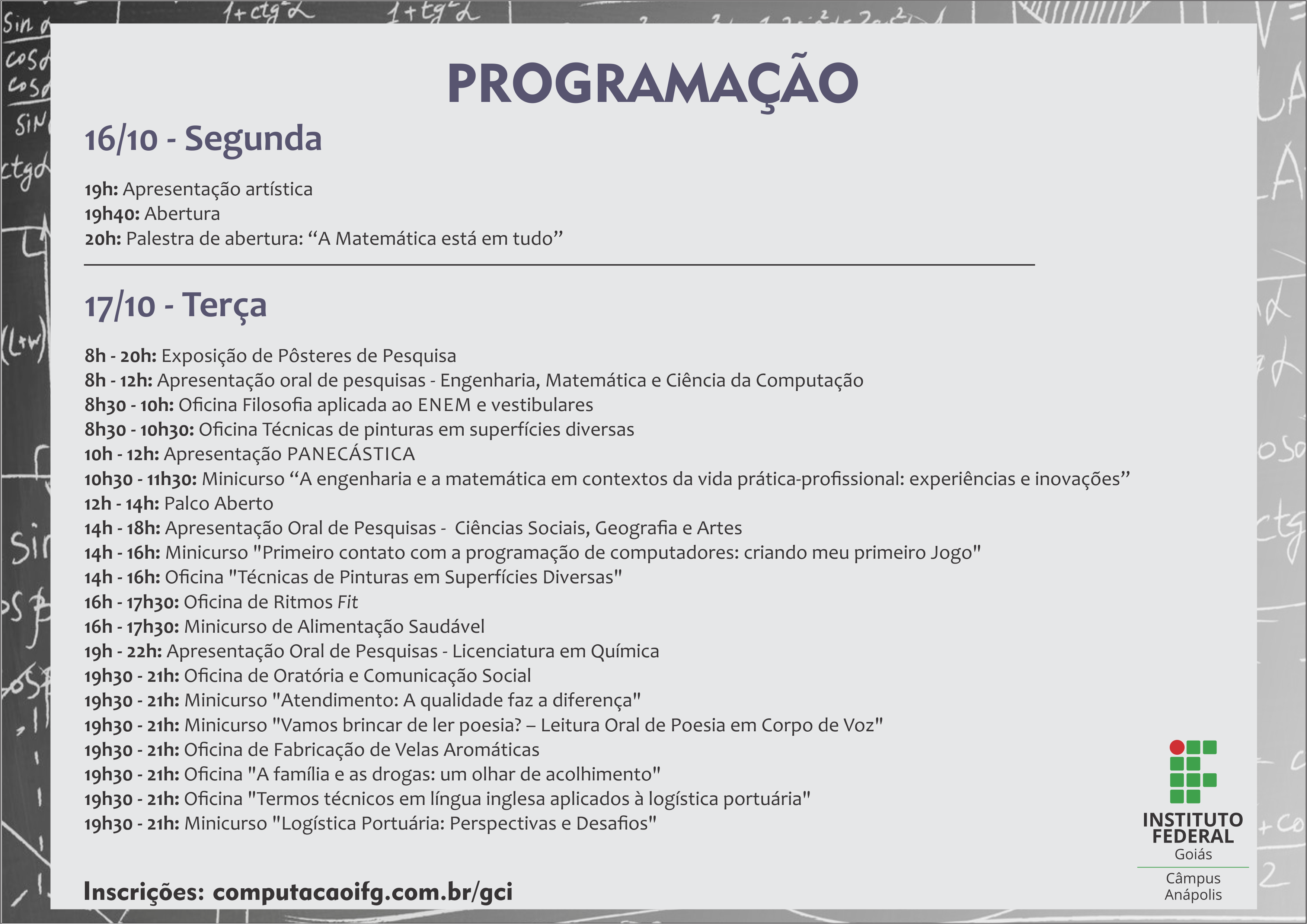 Você está aqui: Página inicial > Comunicados do Câmpus Formosa > IFG > Câmpus > Anápolis > Notícias do Câmpus Anápolis > Palestra sobre matemática marca abertura da 5ª Secitec do Câmpus Anápolis