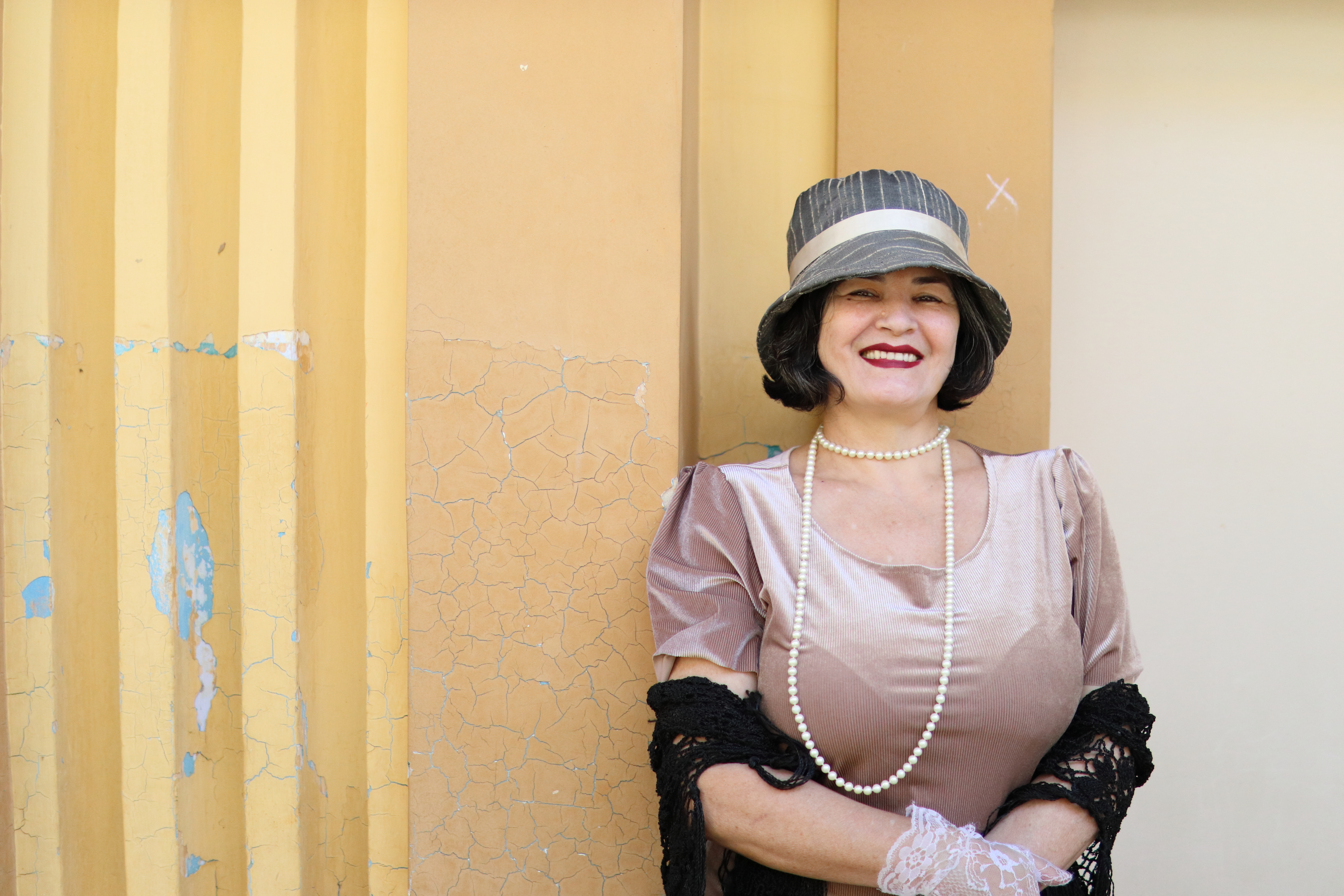 A artista Joana D'arc recepcionou os participantes do Goiânia Art Déco Festival 2023 trajando vestimentas ao estilo dos anos de 1920, periódo de auge do Art Déco na Europa.