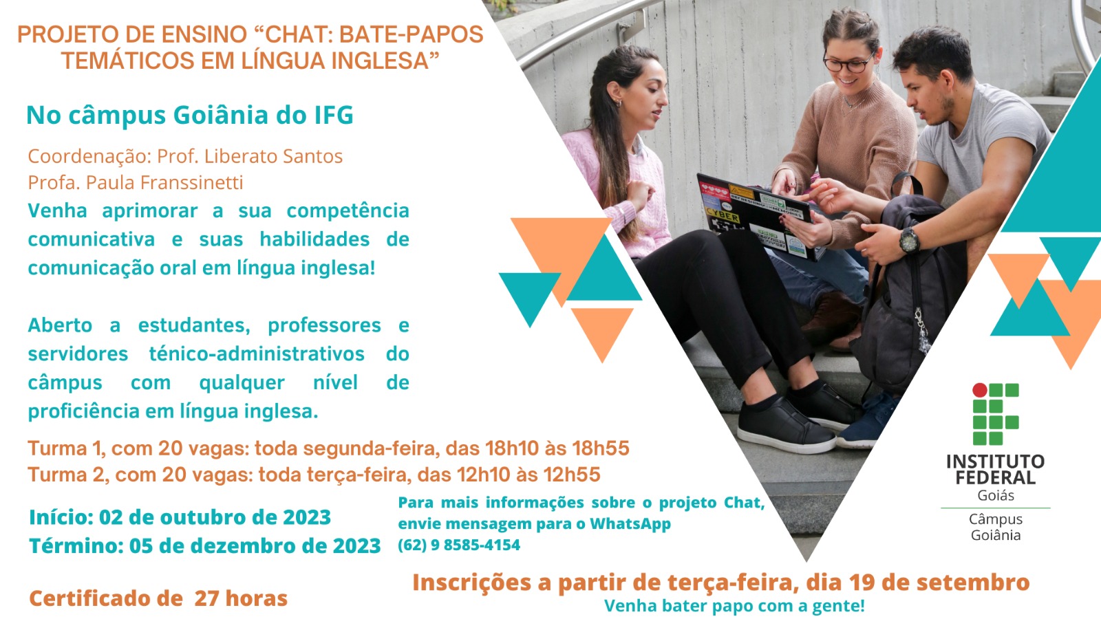 Novo projeto de ensino “Chat: bate-papos temáticos em língua inglesa”, ofertado pelo Câmpus Goiânia do Instituto Federal de Goiás (IFG) recebe inscrições, a partir do dia 19 de setembro, de estudantes e servidores interessados em desenvolverem a competência comunicativa na língua inglesa. As atividades do projeto serão desenvolvidas em duas turmas, com encontros todas segundas e terças-feiras, no turno vespertino. Ao todo, são oferecidas 40 vagas, sendo 20 para cada turma.