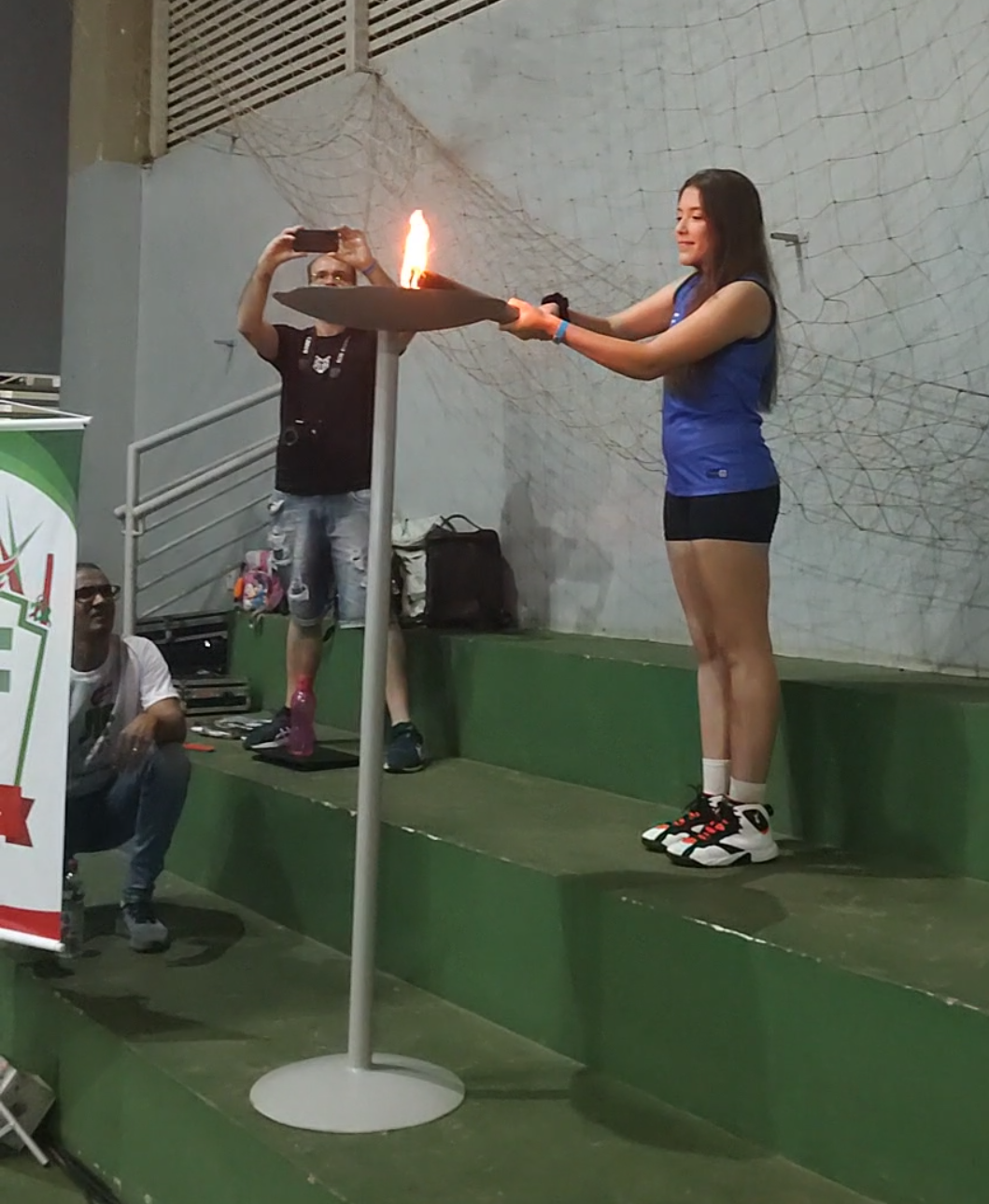Aluna do Câmpus Goiânia Oeste, Geovana Neves, acende a pira olímpica durante a solenidade