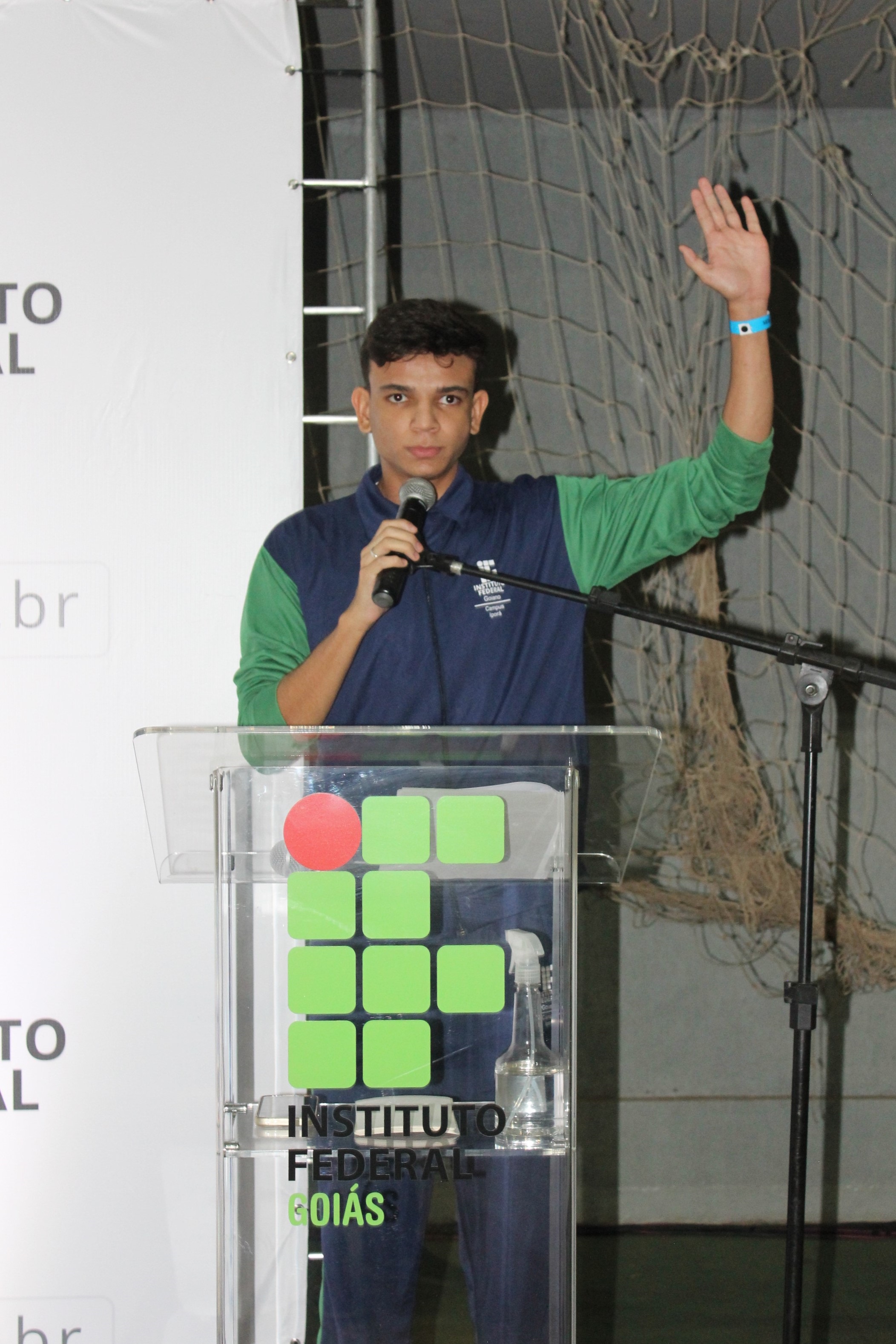 Aluno do Câmpus Iporá do IF Goiano, Vitor Breno Neves, durante o juramento no JIF Centro Oeste 2023