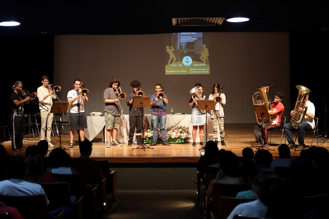 Grupo de Metais se apresentou na solenidade de abertura da Secitec 2023, no Teatro do IFG, no Câmpus Goiânia.