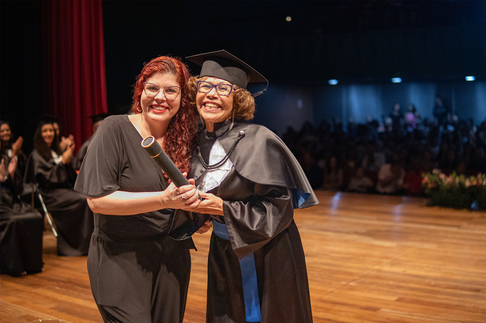 A senhora Maria do Carmo, que já possui o diploma de engenheira civil, concluiu a sua segunda graduação no Câmpus Goiânia após se aposentar. Com muito orgulho de receber seu diploma de licenciada em Matemática, Maria do Carmo conta que o incentivo para uma outra formação veio de sua filha Selena, que fez questão que ela se inscrevesse no edital para portador de diploma. “Eu pensava, será que eu consigo? Ela [a filha] me dizia, mãe veja seus documentos. Eu vi que tinha todos os documentos. Ela me disse vá fazer a redação. No fim, deu certo e agora estou me formando. Muito feliz”, disse Maria do Carmo, que finalizou abraçando e agradecendo a sua filha Selena.