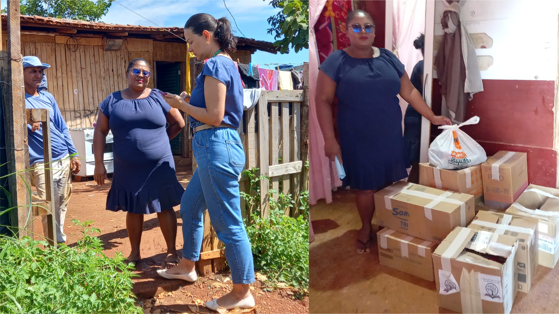 Izenilde da Conceição da Silva recebe doações entregues pela servidora Amanda Falchi.