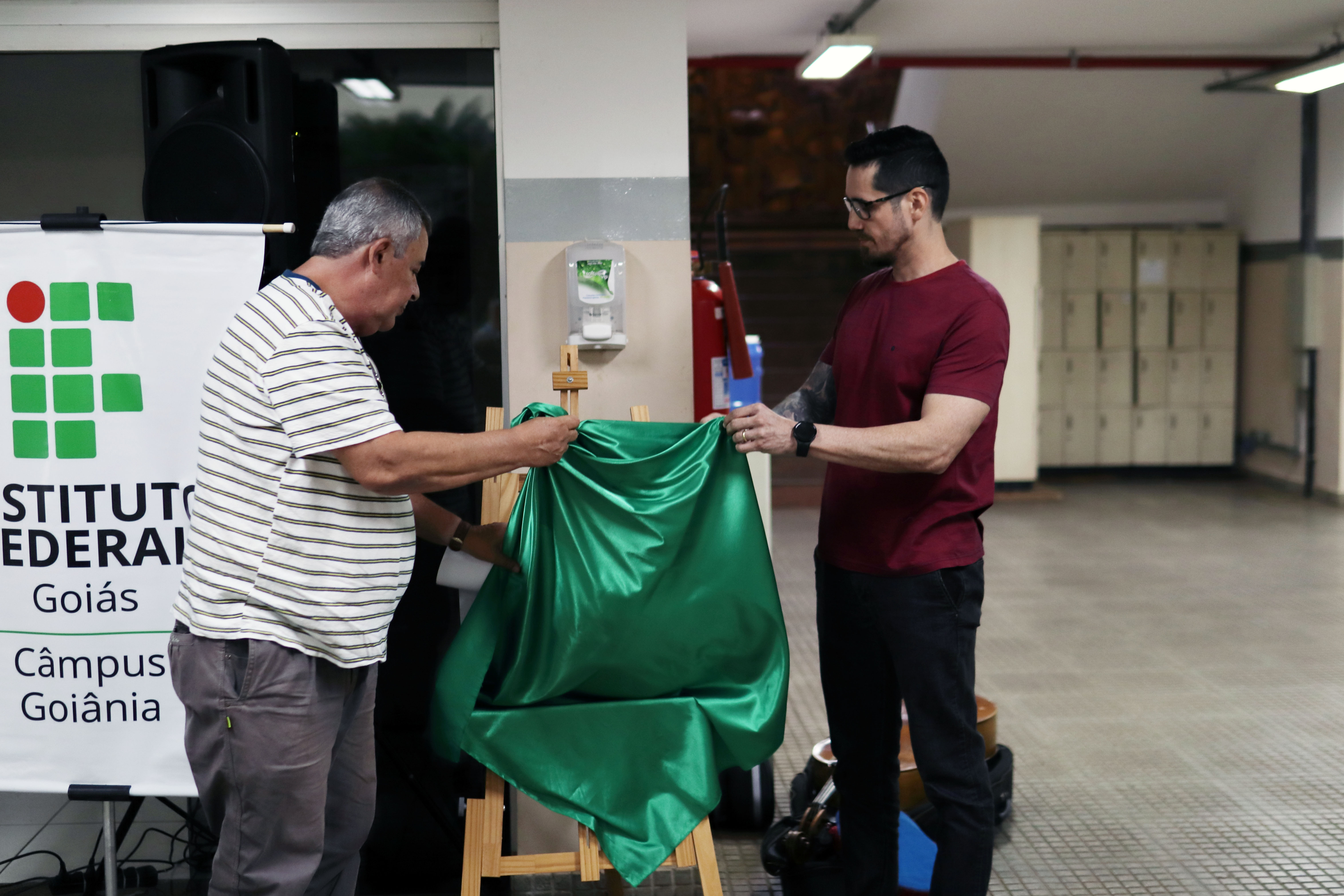 O esposo da professora Ana Lúcia, Roberto, e o Gerente de Pesquisa, Pós-Graduação e Extensão (Gepex) do Câmpus Goiânia, professor Cristiano da Costa, no descerramento da placa em homenagem à professora falecida.