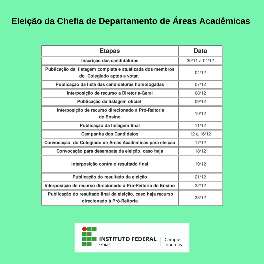 O prazo para inscrições de candidaturas à Chefia do Departamento de Áreas Acadêmicas (DAA) do IFG-Câmpus Inhumas começa nesta segunda-feira e segue até sexta, dia 4 de dezembro. De acordo com o Regulamento da Eleição, os candidatos deverão inscrever-se via Requerimento no Sistema Unificado de Administração Pública (SUAP), direcionando-o para a Diretoria-Geral do câmpus.