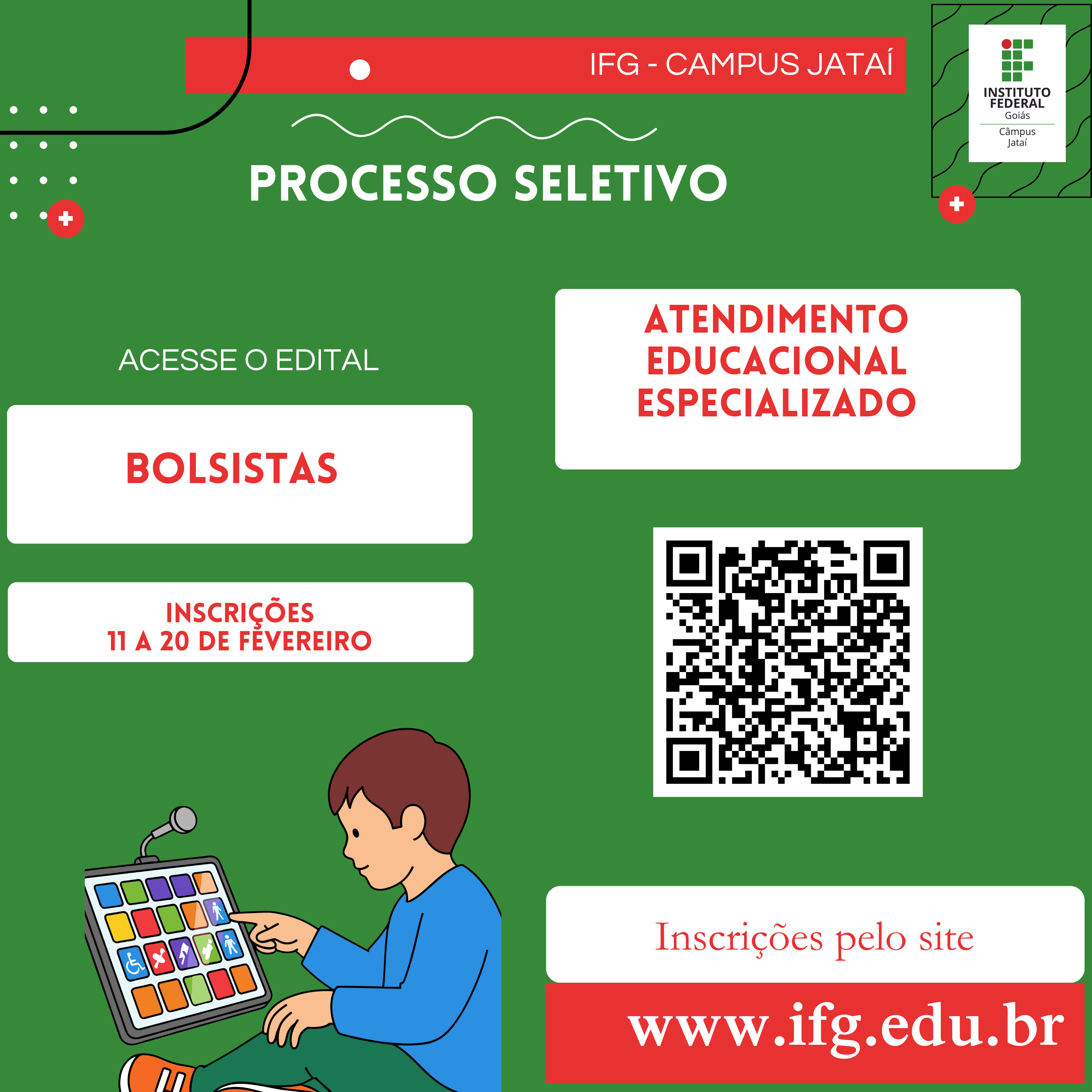 O Câmpus Jataí do Instituto Federal de Goiás (IFG) publicou o Edital nº 7/2026, que trata da seleção de interessados em atuar no Projeto Institucional de Ensino “Acesso, Participação, Permanência e Aprendizagem de Estudantes com Necessidades Educacionais Específicas”. A iniciativa é coordenada pelo Núcleo de Apoio às Pessoas com Necessidades Educacionais Específicas (NAPNE) e...