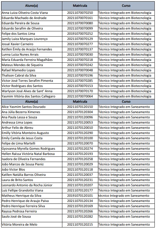 A Coordenação de Registros Acadêmicos e Escolares do Instituto Federal de Educação, Ciência e Tecnologia de Goiás / Câmpus Formosa informa a relação dos(as) alunos(as) concluintes do ano de 2023, dos cursos Técnicos Integrados em Biotecnologia e Saneamento, APTOS(AS) a participarem da Cerimônia de Certificação: