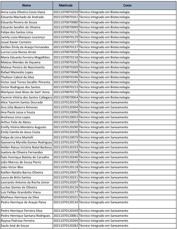 A Coordenação de Registros Acadêmicos e Escolares (Corae) do Instituto Federal de Educação, Ciência e Tecnologia de Goiás / Câmpus Formosa informa a relação dos(as) alunos(as) concluintes do ano de 2023, dos cursos Técnicos Integrados em Biotecnologia e Saneamento, APTOS(AS) a participarem da Cerimônia de Certificação, após retificação da Corae neste dia 6 de fevereiro: