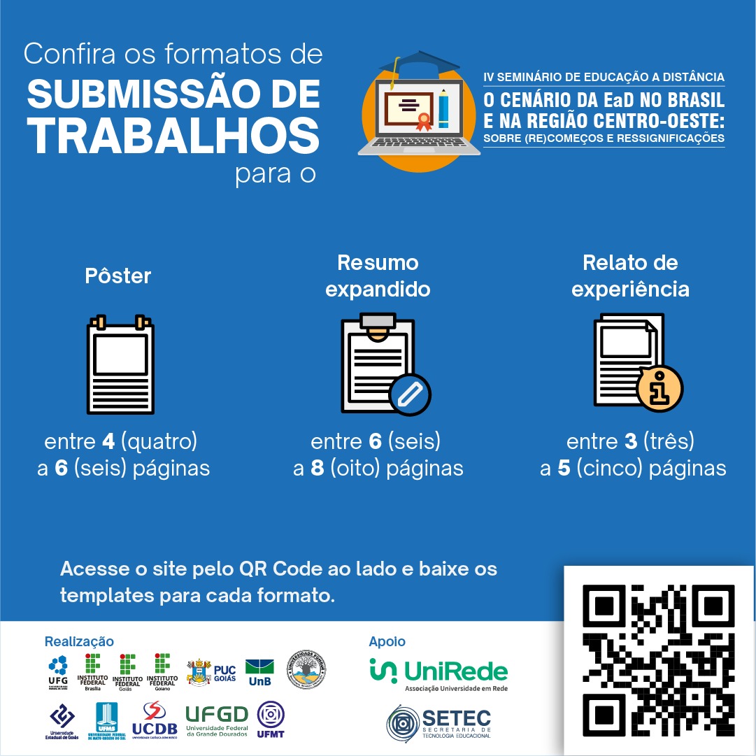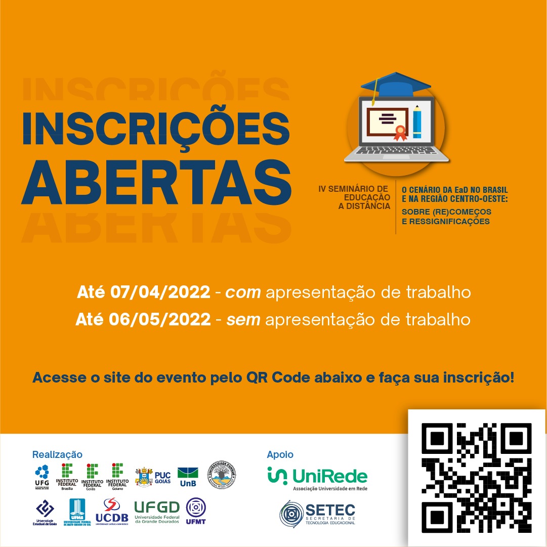 De 9 a 23 de maio, será realizado o IV Seminário de Educação a Distância, tendo como tema principal: O Cenário da EaD no Brasil e na Região Centro-Oeste: sobre (re) começos e ressignificações, organizado pela Universidade Federal de Mato Grosso, em parceria com as demais Instituições Públicas de Ensino Superior, e com o apoio da Associação Universidade em Rede- UniRede, da qual o IFG faz parte. O evento será realizado no formato online e as inscrições estão abertas.