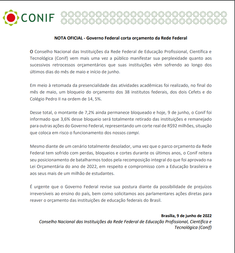 O Conselho Nacional das Instituições da Rede Federal de Educação Profissional, Científica e Tecnológica (Conif) publicou uma nota a respeito dos cortes orçamentários que suas...