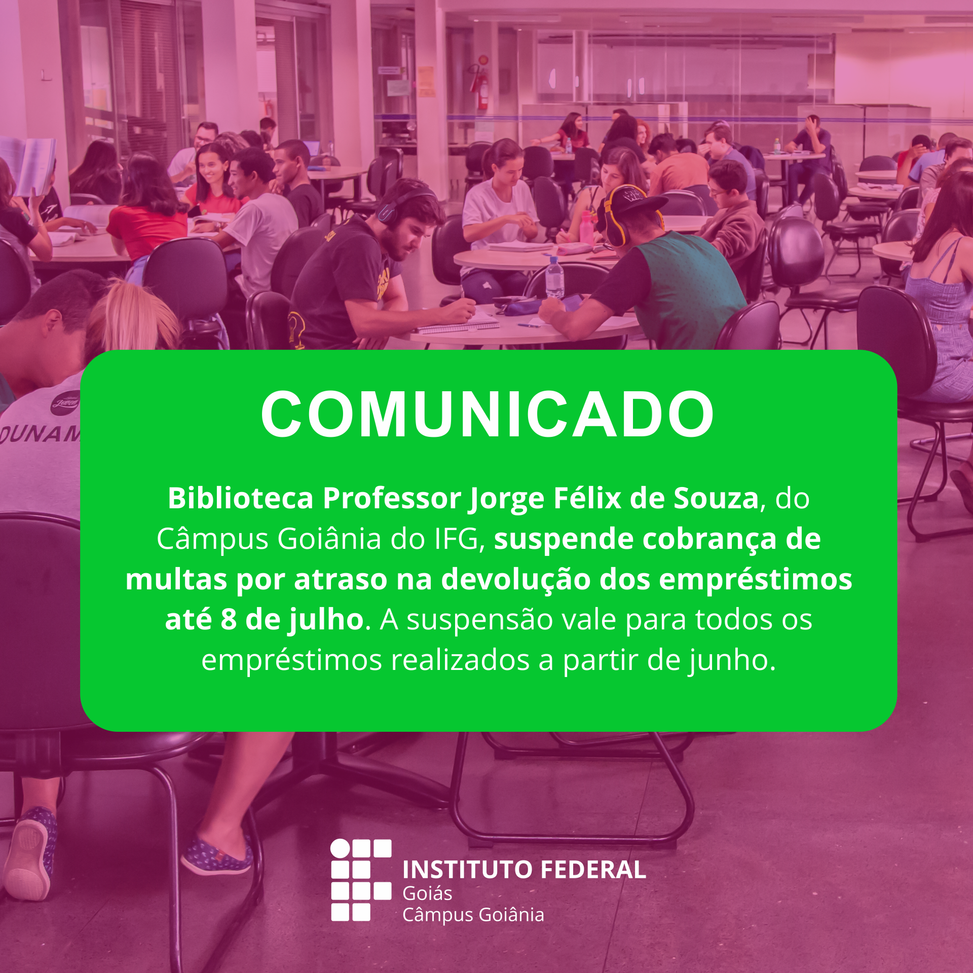 Nesta sexta-feira, 10 de junho, a Coordenação da Biblioteca Professor Jorge Félix de Souza, do Câmpus Goiânia do IFG, expediu comunicado no qual suspende as multas cobradas aos...