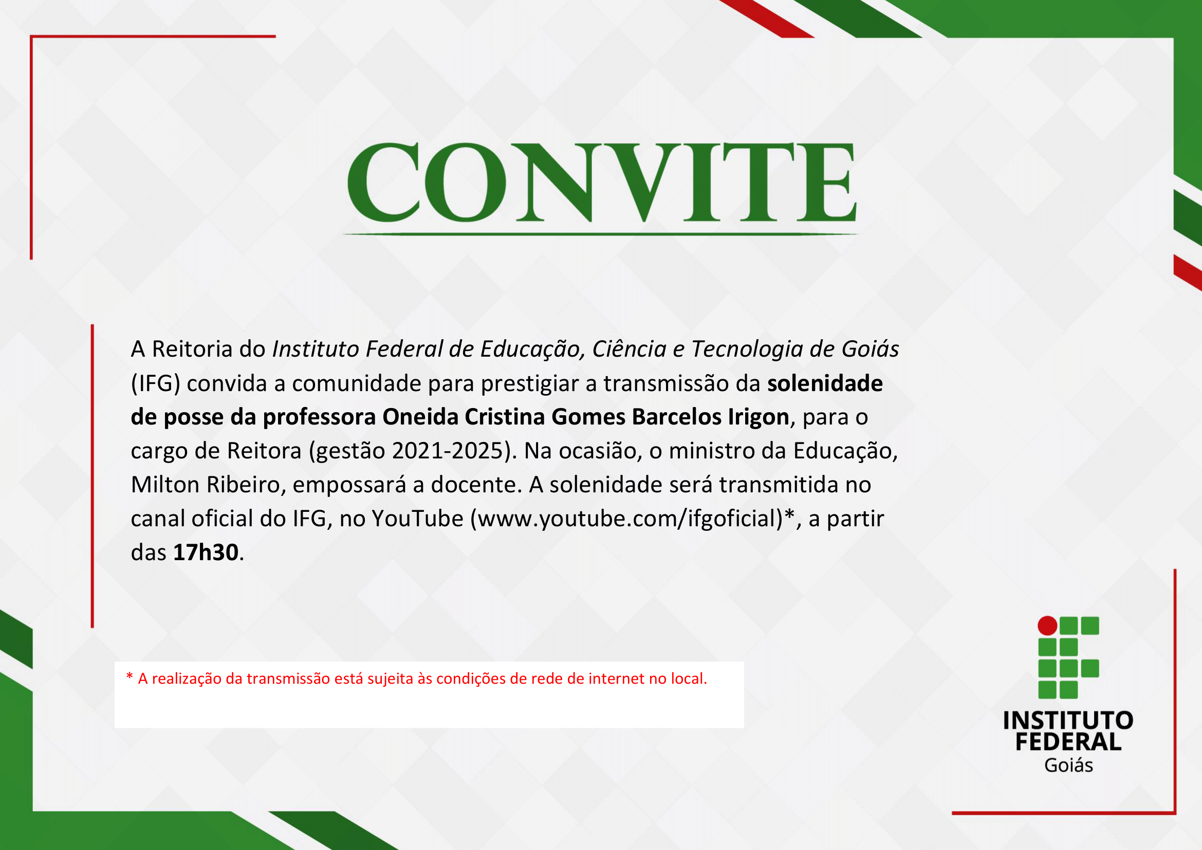 A Reitoria do Instituto Federal de Educação, Ciência e Tecnologia de Goiás (IFG) convida a comunidade para prestigiar a transmissão da solenidade de posse da professora Oneida Cristina...