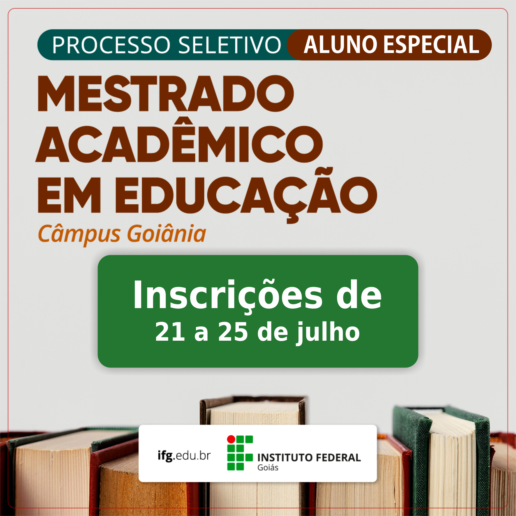 A Coordenação do Mestrado Acadêmico em Educação do Câmpus Goiânia publicou edital de seleção de alunos especiais - interessados em cursar disciplinas oferecidas no curso de...