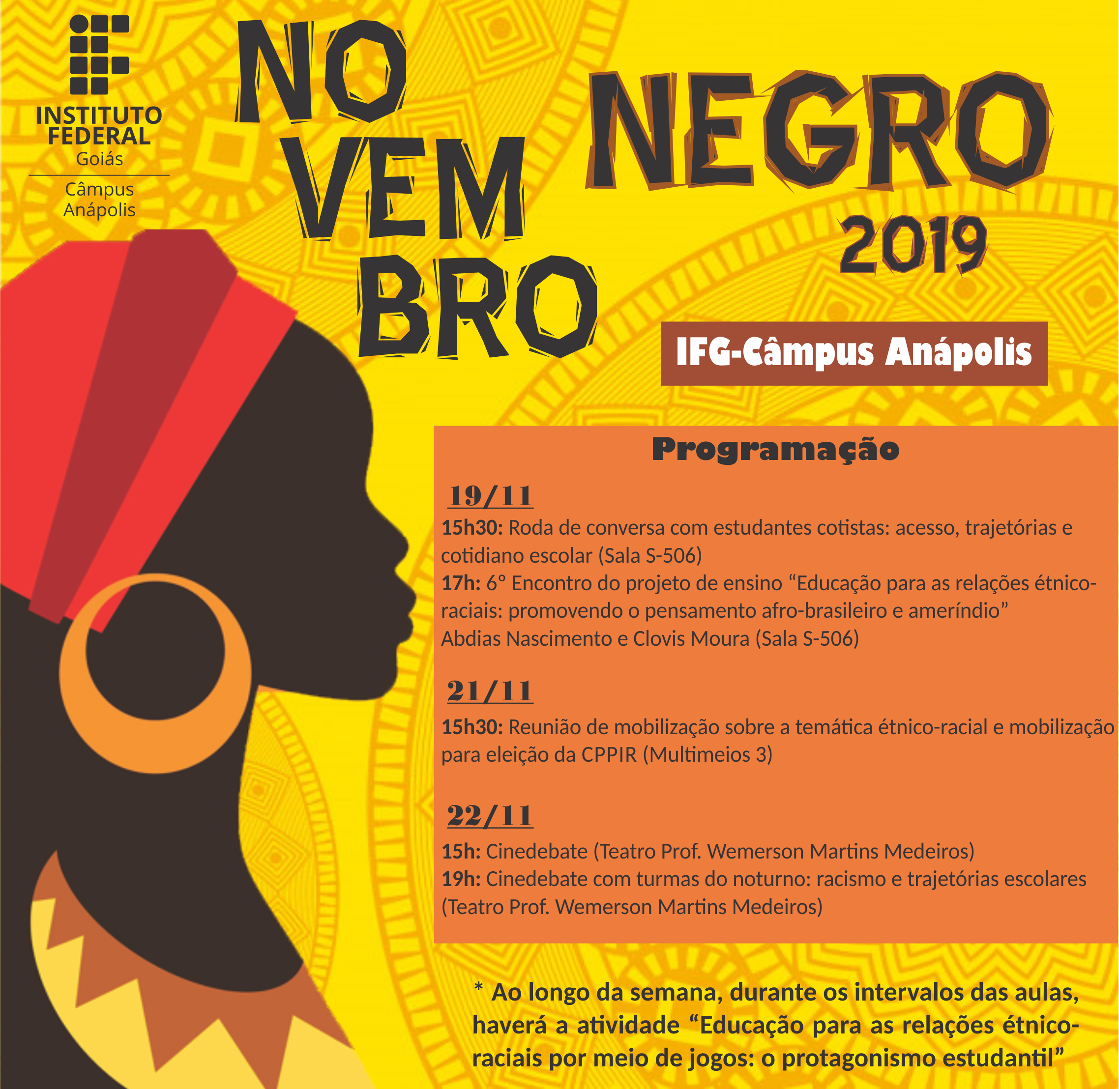 O Instituto Federal de Goiás (IFG) - Câmpus Anápolis inicia nesta terça-feira, 19, a programação do Novembro Negro 2019. Confira a seguir a programação completa das atividades alusivas ao Dia da Consciência Negra, oficialmente celebrado em 20 de novembro: