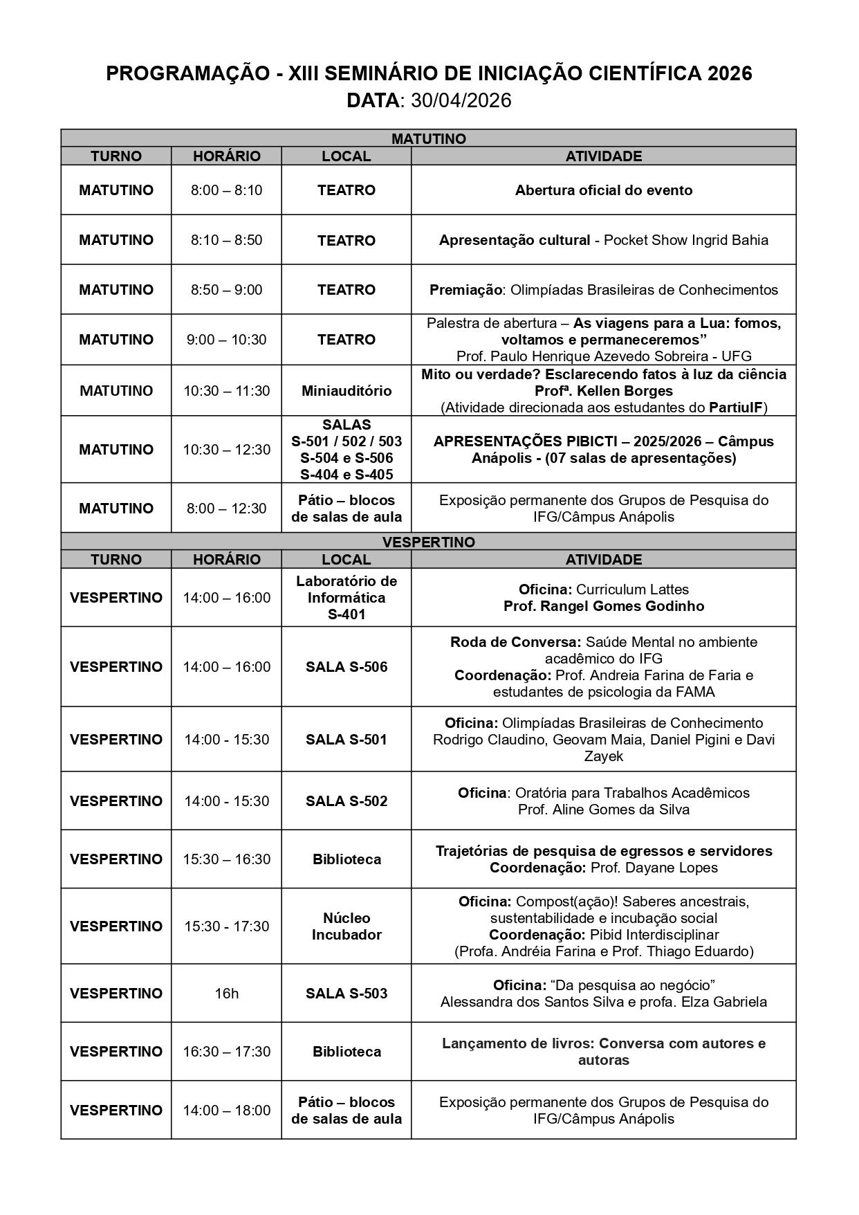 Divulgada a programação do XIII Seminário de Iniciação Científica do IFG Câmpus Anápolis