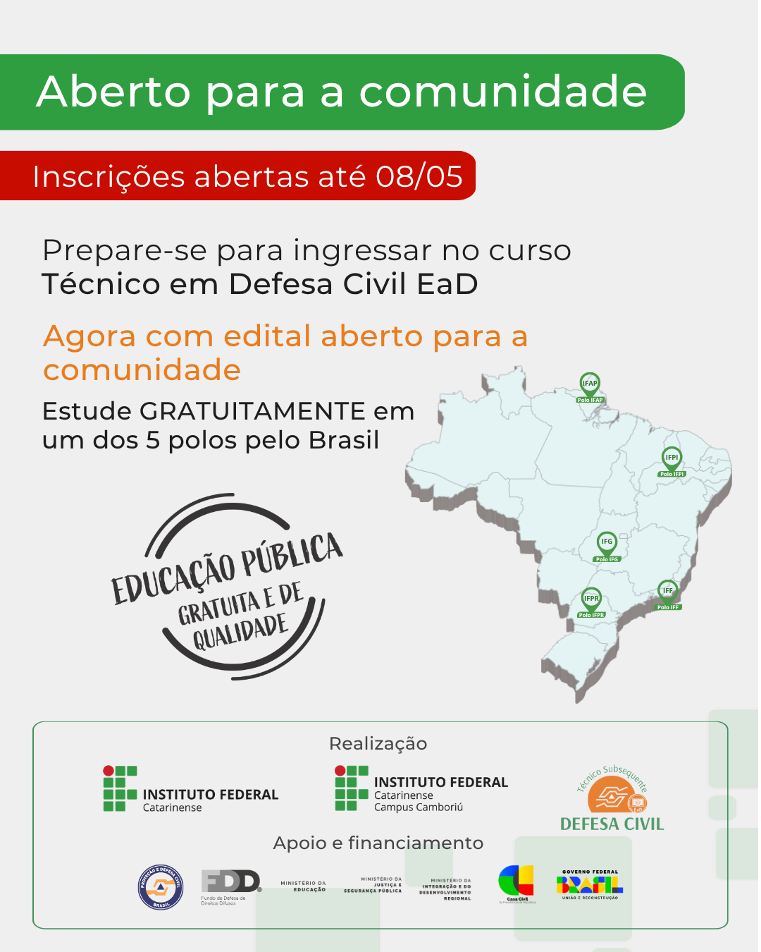 A ampliação do curso em nível nacional foi viabilizada por meio de parceria entre o Instituto Federal Catarinense e órgãos do Governo Federal, incluindo os Ministérios da Educação; da Integração e do Desenvolvimento Regional; e da Justiça e Segurança Pública, além da Secretaria Nacional de Proteção e Defesa Civil. A iniciativa conta com recursos do Fundo de Defesa de Direitos Difusos (FDD) e apoio da Casa Civil da Presidência da República.