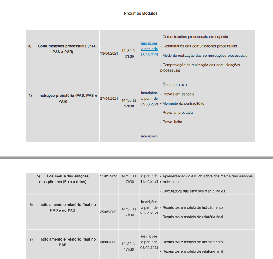 A Controladoria-Geral da União (CGU) e a Corregedoria-Geral da União (CRG) disponibiliza o 2º módulo da formação em assuntos disciplinares. A formação ocorrerá no dia 23 de março, das 14h30 às16h30. A oferta ocorre por meio do Programa de Desenvolvimento e Aperfeiçoamento Contínuo em Corregedoria e será exclusivamente on-line. As inscrições devem ser realizadas no link: https://corregedorias.gov.br/acoes-e-programas/cursos/cursos-online-crg
