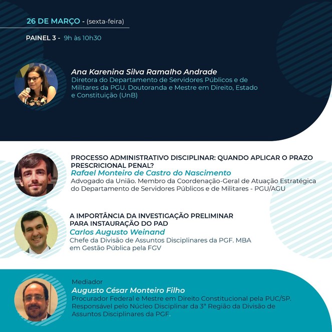 A Escola da Advocacia-Geral da União (AGU) realiza o seminário Temas Correcionais Contemporâneos, nos dias 24 e 26 de março, das 9 às 12h30, on-line. As inscrições devem ser realizadas no link: https://docs.google.com/forms/d/e/1FAIpQLSdFzXoZEm-b0KX67td4V2x4W6ShVzdKdIpqDG04zJzK3vi4LQ/viewform