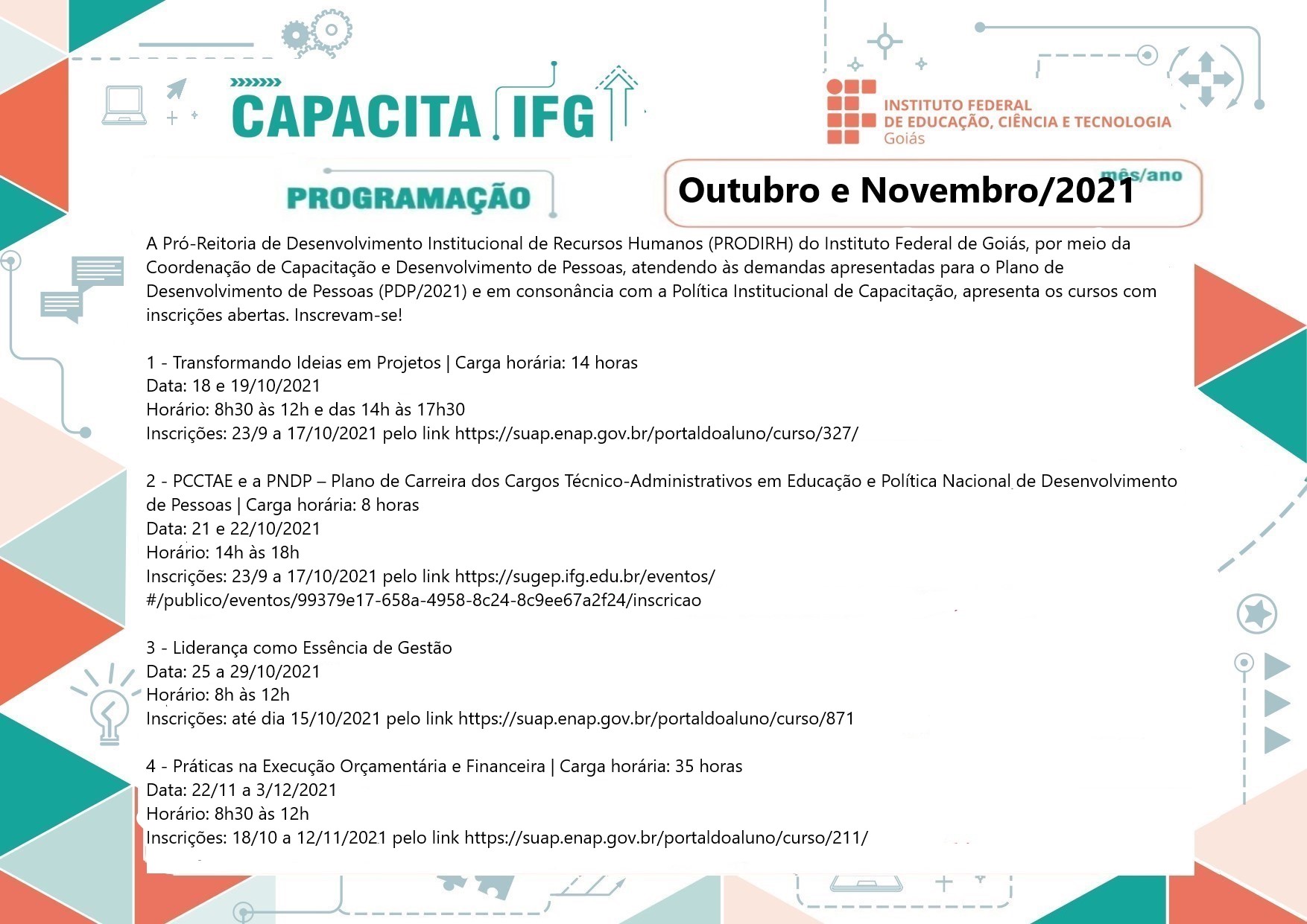 A Pró-Reitoria de Desenvolvimento Institucional de Recursos Humanos (PRODIRH) do Instituto Federal de Goiás, por meio da Coordenação de Capacitação e Desenvolvimento de Pessoas, atendendo às demandas apresentadas para o Plano de Desenvolvimento de Pessoas (PDP/2021) e em consonância com a Política Institucional de Capacitação, apresenta os cursos com inscrições abertas. Inscrevam-se!