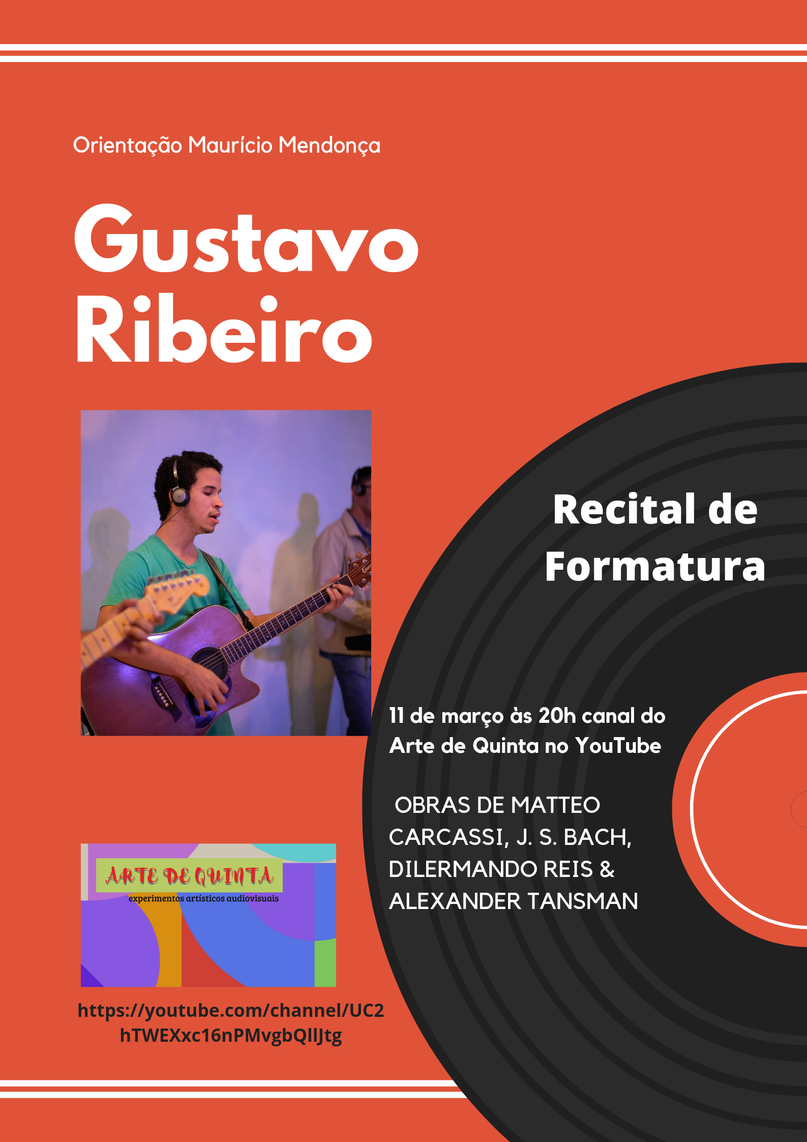 Sob orientação do professor Maurício Mendonça, Gustavo Ribeiro interpretará, no violão, obras de Matteo Carcassi, J. S. Bach, Dilermando Reis e Alexander Tansman.