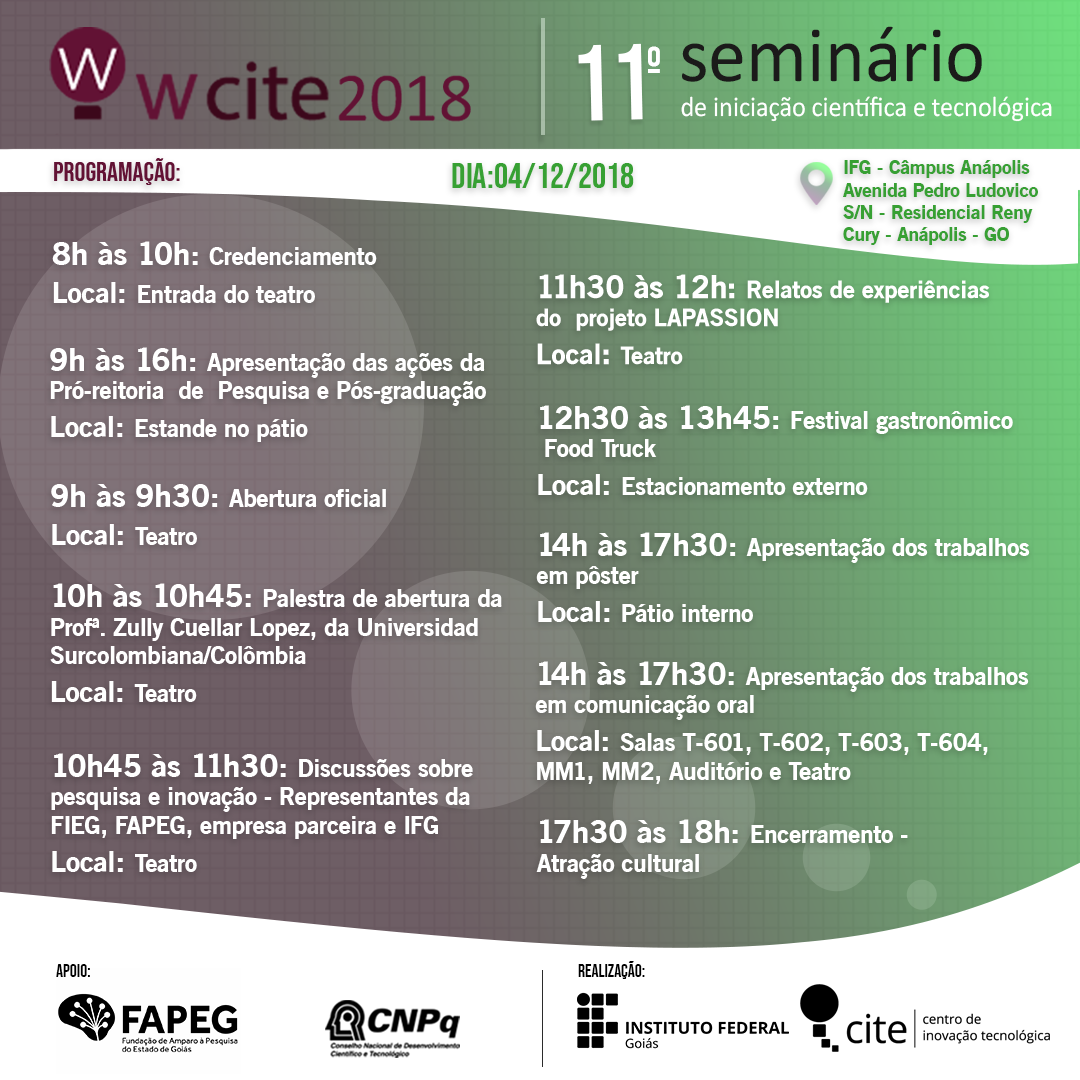 O Instituto Federal de Goiás (IFG), por meio de sua Pró-Reitoria de Pesquisa e Pós-Graduação (Proppg), realiza na próxima terça-feira, 4 de dezembro, o 11º Seminário de Iniciação Científica e Tecnológica (SICT). Junto com o evento, será realizado também o Workshop de Ciência, Inovação e Tecnologia (Wcite). Dessa vez quem sedia o Seminário, que tem como objetivo discutir e apresentar temas relacionados à pesquisa científica e tecnológica no âmbito da Instituição, é o Câmpus Anápolis. As inscrições para participar do evento estão abertas e podem ser feitas aqui.