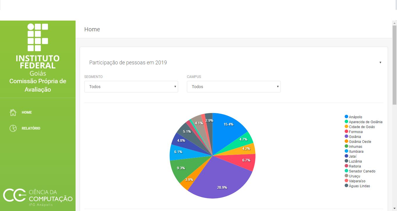 Em 2019, houve avanço na forma de demonstrar os resultados das autoavaliações institucionais. Como destaca a presidente da CPA, “o desenvolvimento de uma plataforma pelo professor Daniel Xavier Sousa, do Câmpus Anápolis, e por seu aluno, Bruno Araújo Alves, ajudou muito na forma de apresentar os resultados da pesquisa”. Para a docente, a ferramenta para coleta da pesquisa e demonstração dos resultados tornou o processo de autoavaliação mais dinâmico e efetivo. “Essa ferramenta tem como finalidade a demonstração dos resultados da pesquisa de autoavaliação à comunidade interna, externa e avaliadores do MEC/INEP de forma mais rápida, além de facilitar a elaboração dos relatórios de autoavaliação pela comissão central e locais da CPA”, destacou a professora.